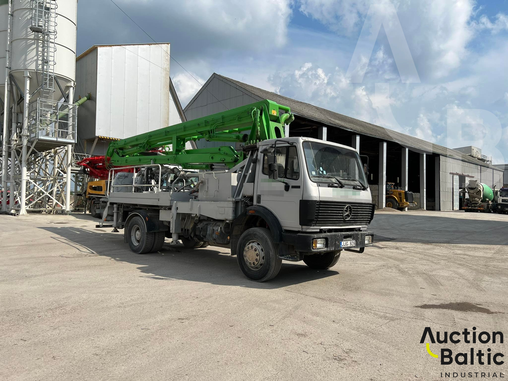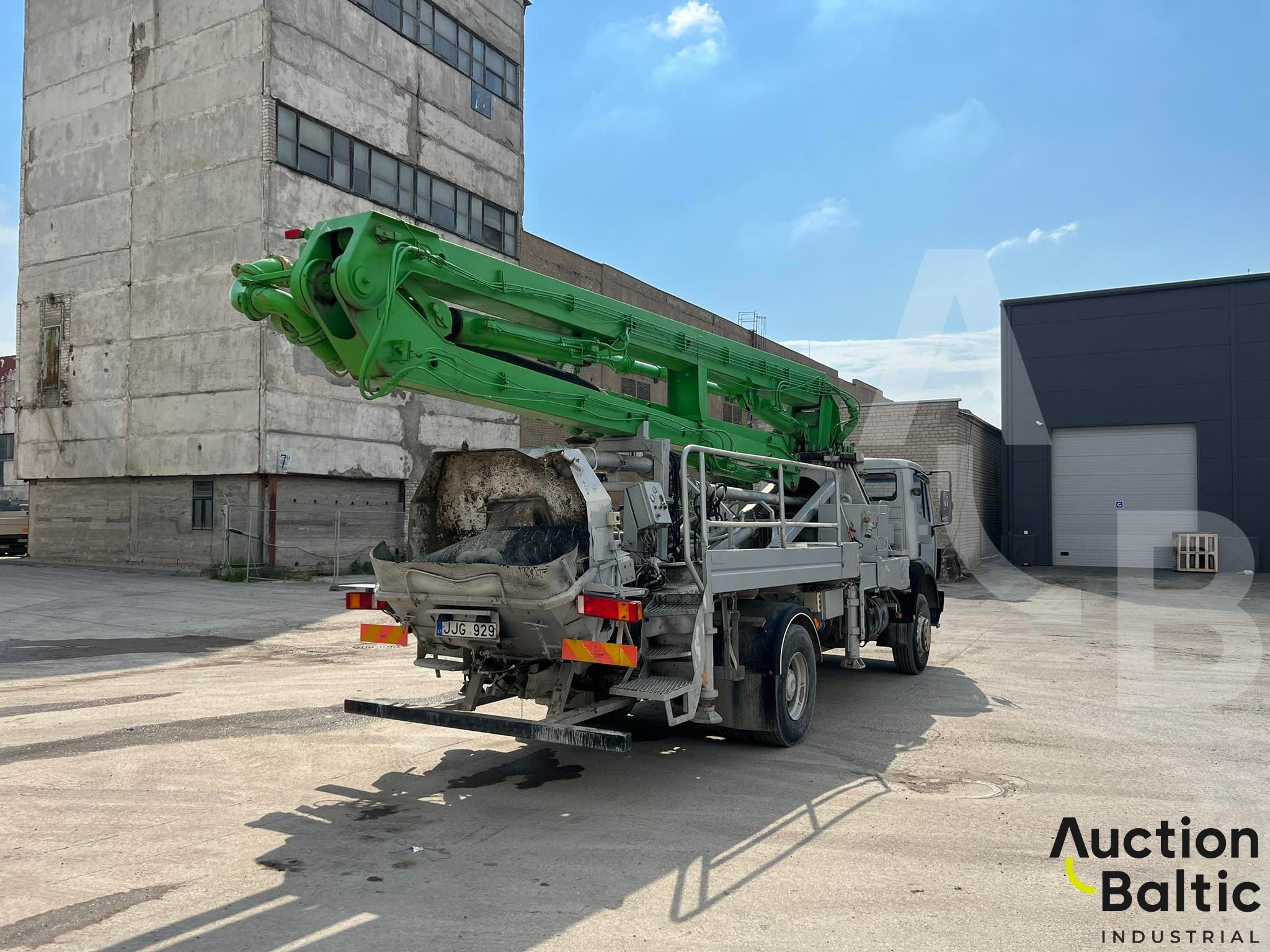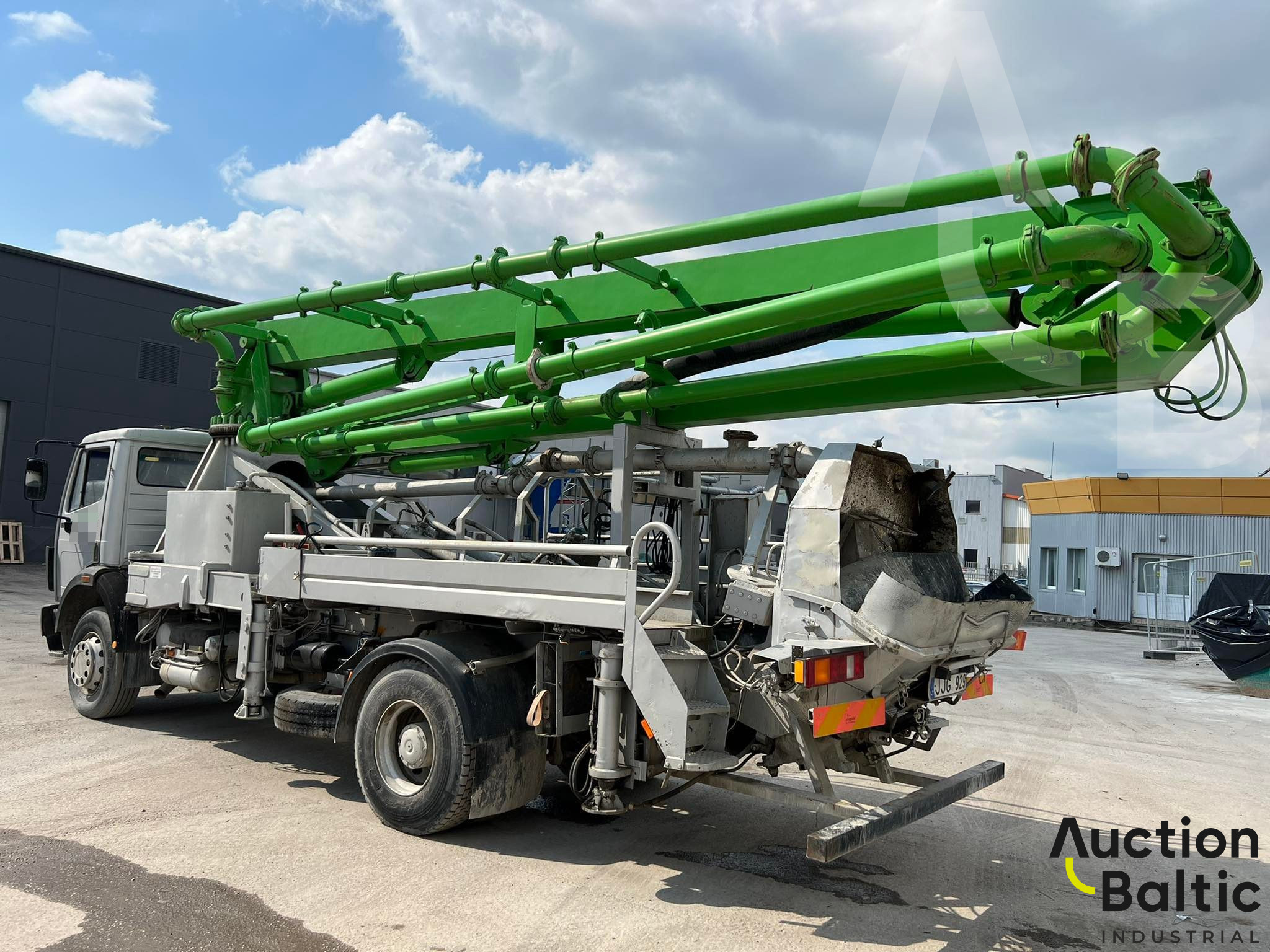 The truck with concrete pump is in working condition.