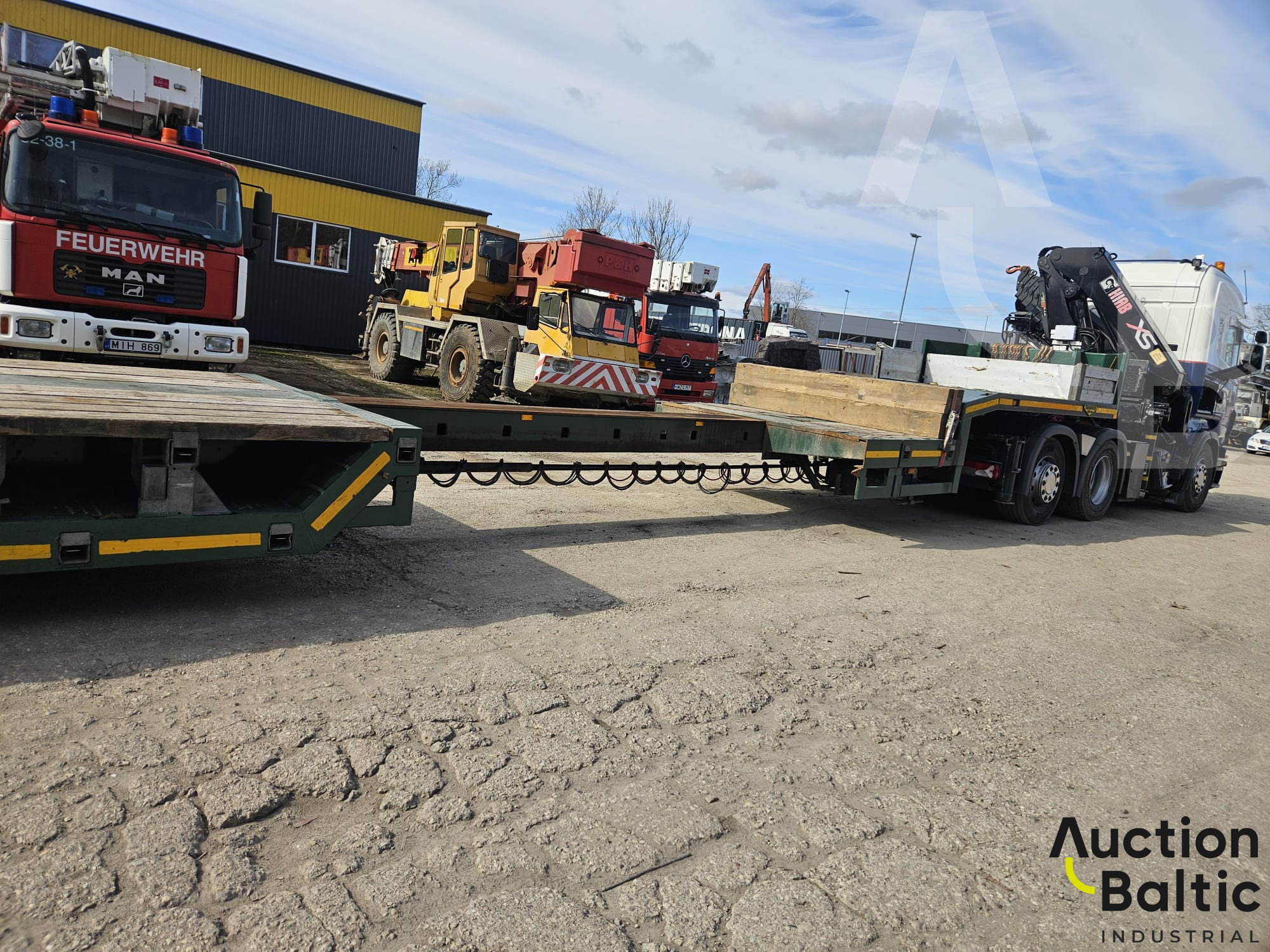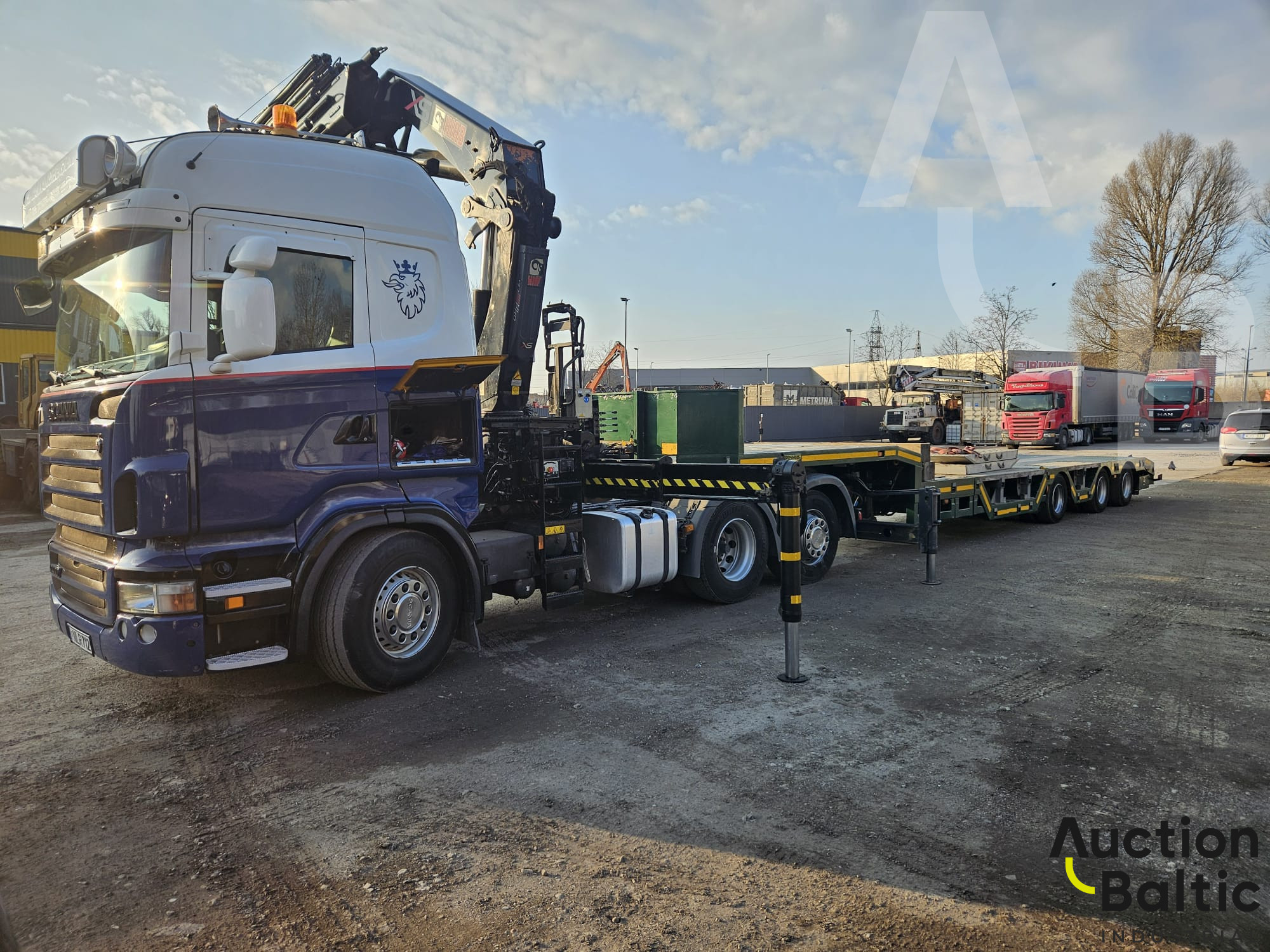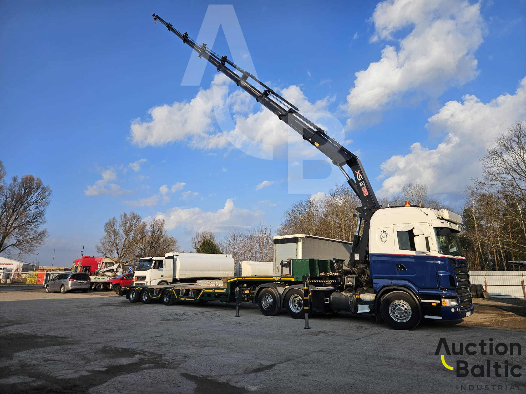 Truck with trailer and crane in working condition.