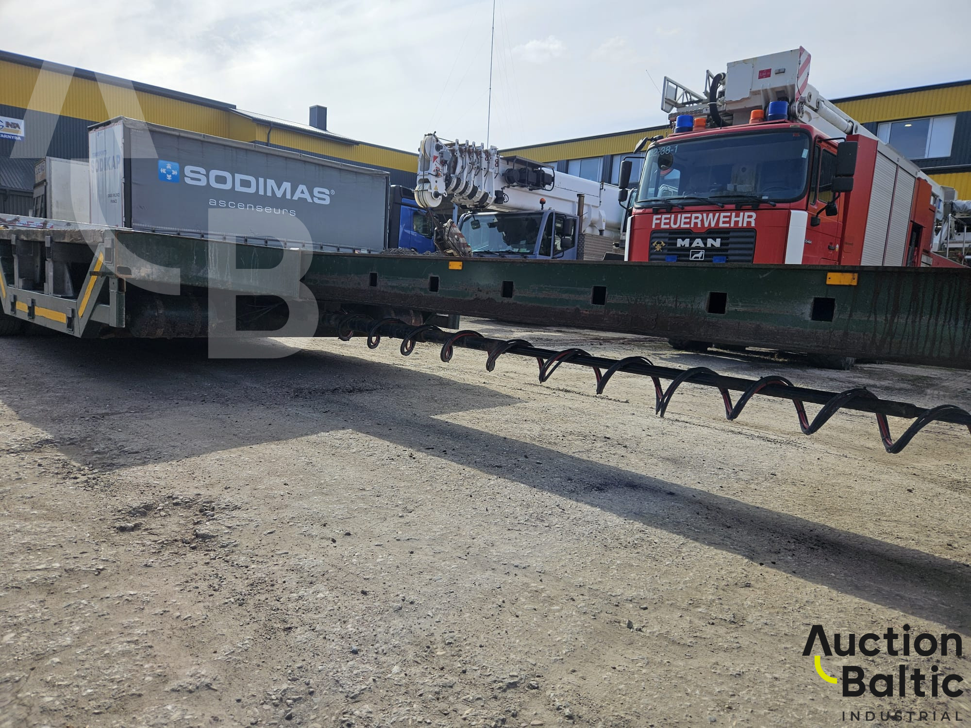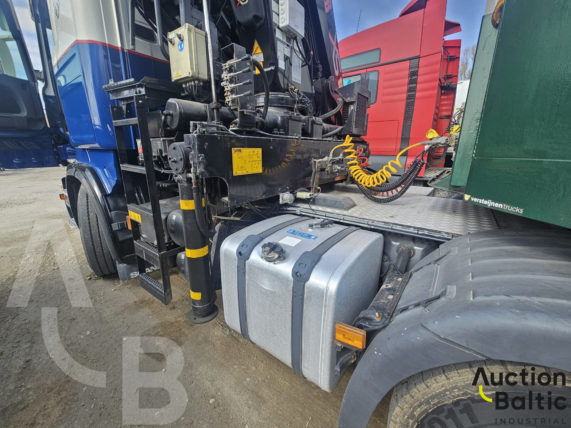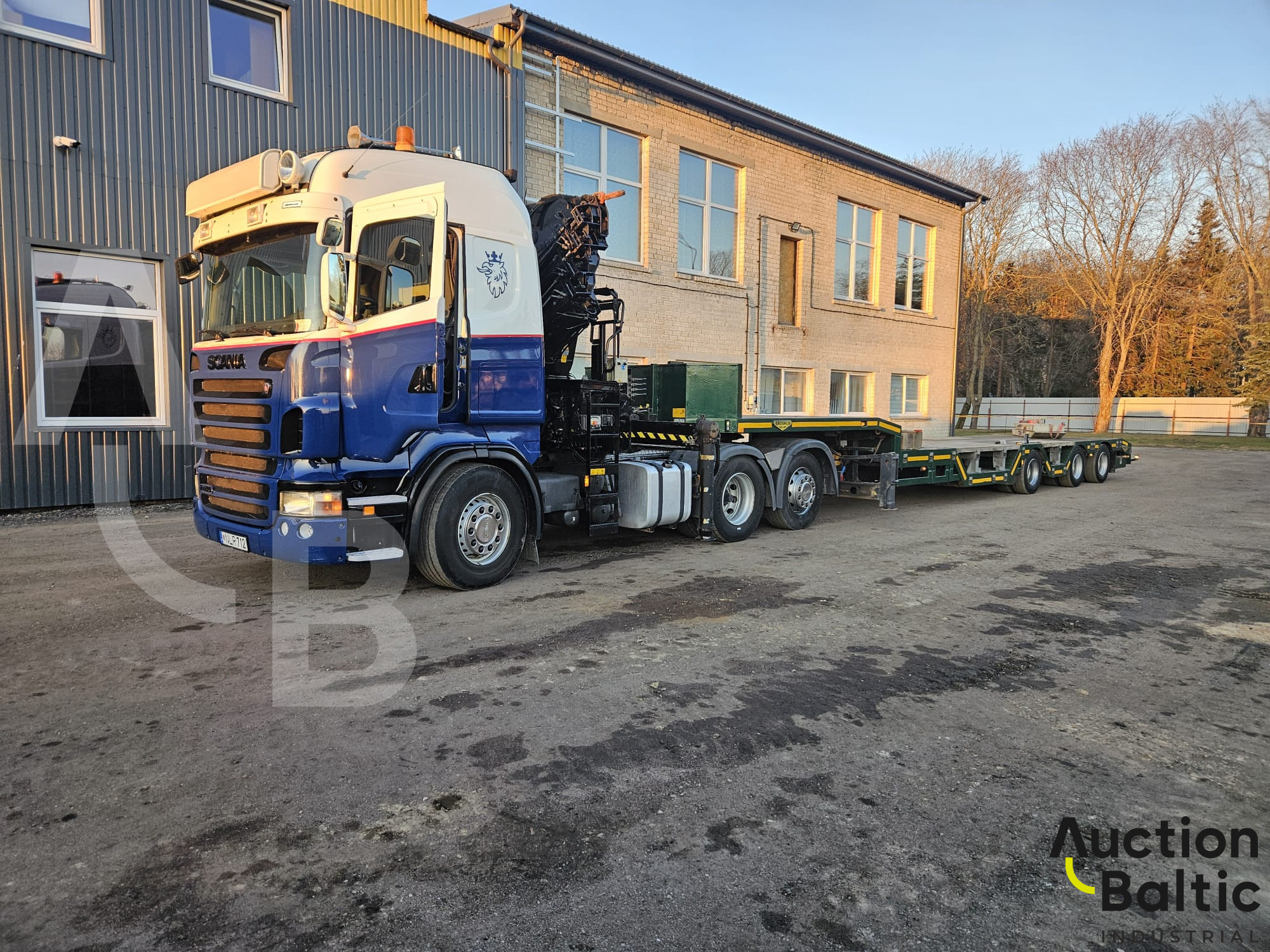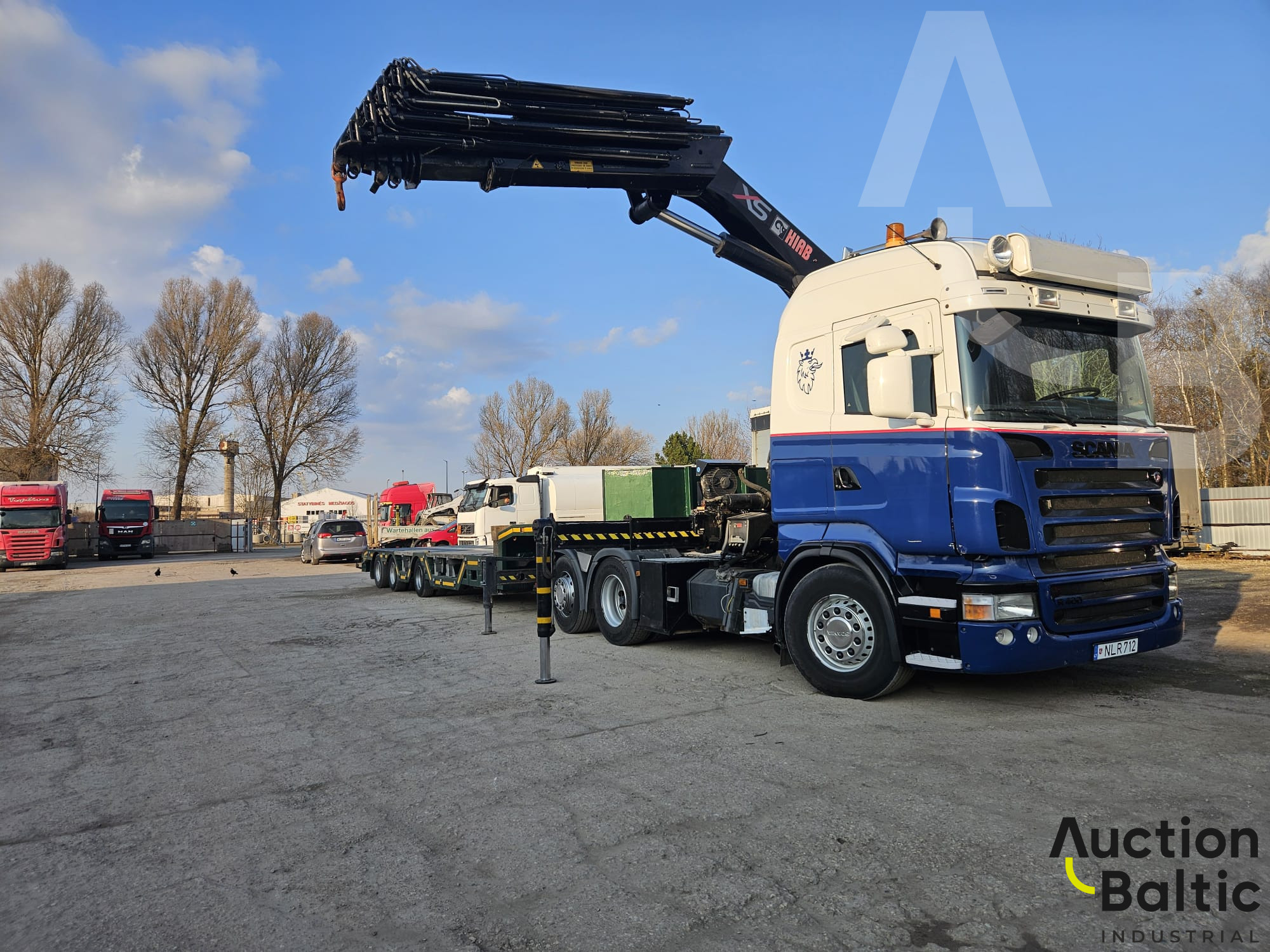 Truck with trailer and crane in working condition.