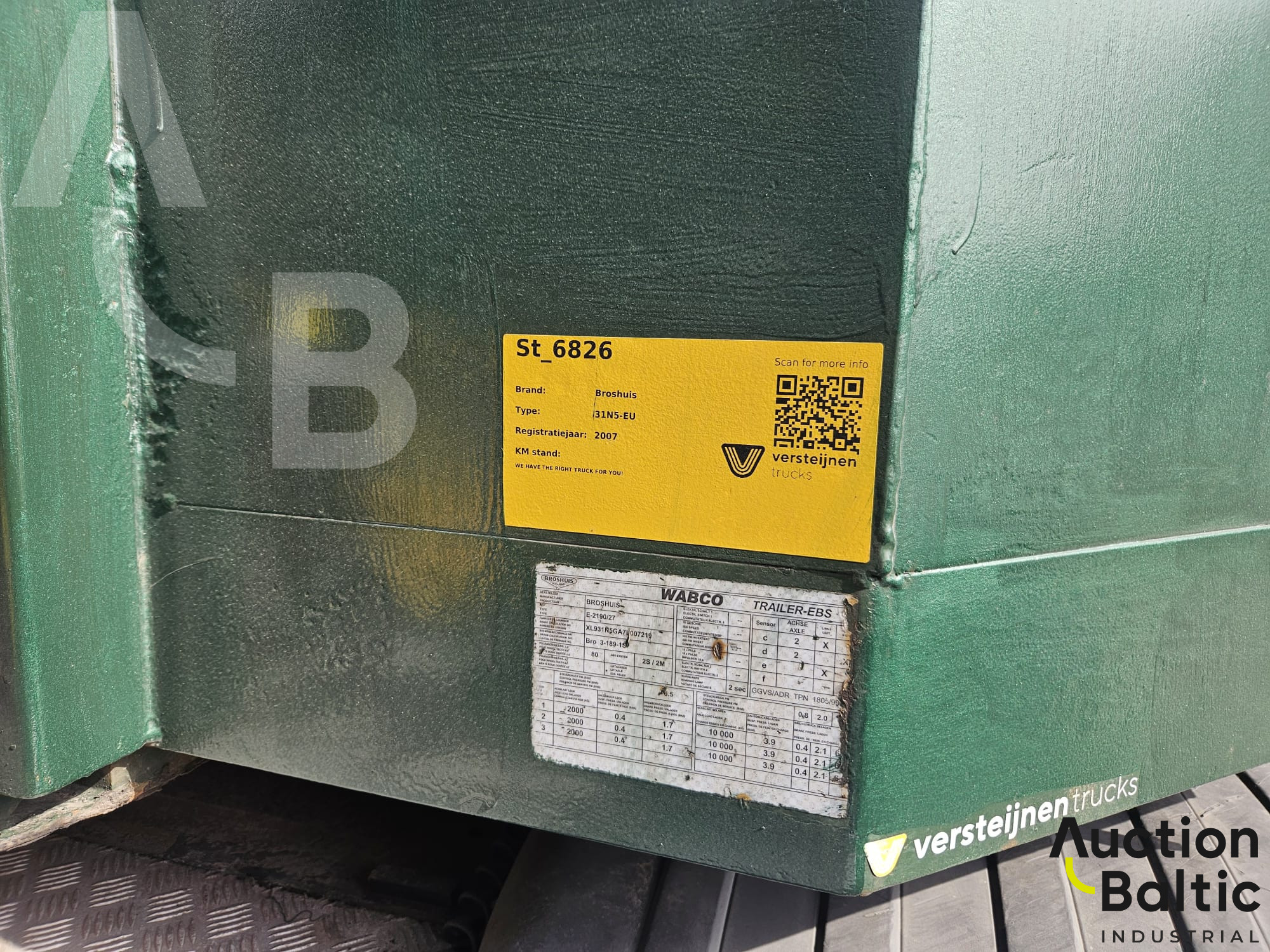 Triler Broshuis 31N5-EU, svoris - 10 500 kg, bendroji masė - 53 600 kg, metai - 2007 m, VIN: XL931N5GA7L007219, techninė apžiūra galioja iki 2026-09-03.